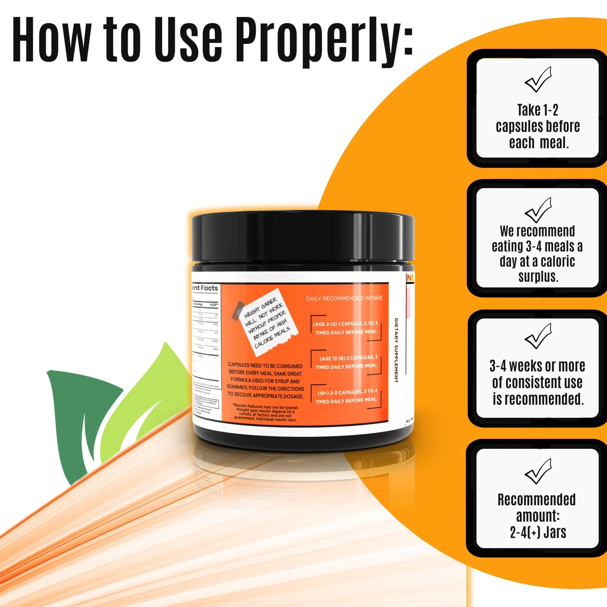 Take 1-3 capsules for breakfast, 1-3 capsules for lunch and 1-3 capsules at night. (Check back of Jar for Age and Size Requirements) Eat 3-4 meals and drink over 8 glasses of water a day for best results. Recommended Amount: 2-4(+) Jars Average timeframe of improvement seen in as soon as 3-4 weeks of consistent use. (Results may vary) Enjoy your weight gain journey!