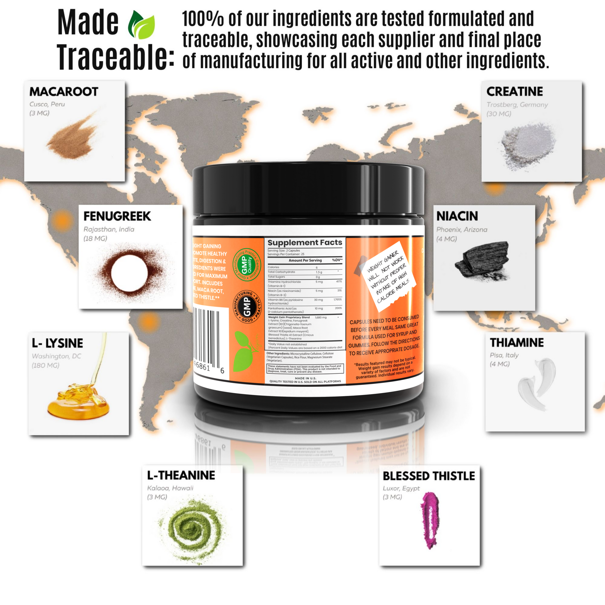 Thiamine, Niacin, Vitamin B-6, Pantothenic acid, Lysine, Creatine, Fenugreek, Blessed thistle, L-theanine, and Maca root in herbal form. Our ingredients help with powerful components in your body such as supporting aerobic metabolism,cell growth, energy conversion, immune system health, and hormonal balance to maximize weight gain support.